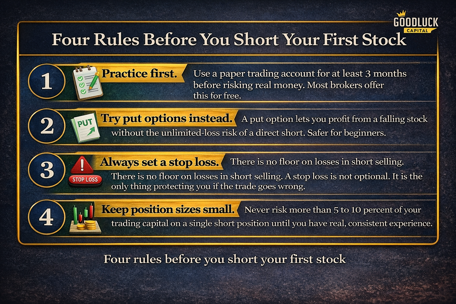 One important rule (Uptick Rule): you can only short a stock after its price has ticked up slightly. This rule was designed to stop short sellers from piling on a stock that is already crashing.