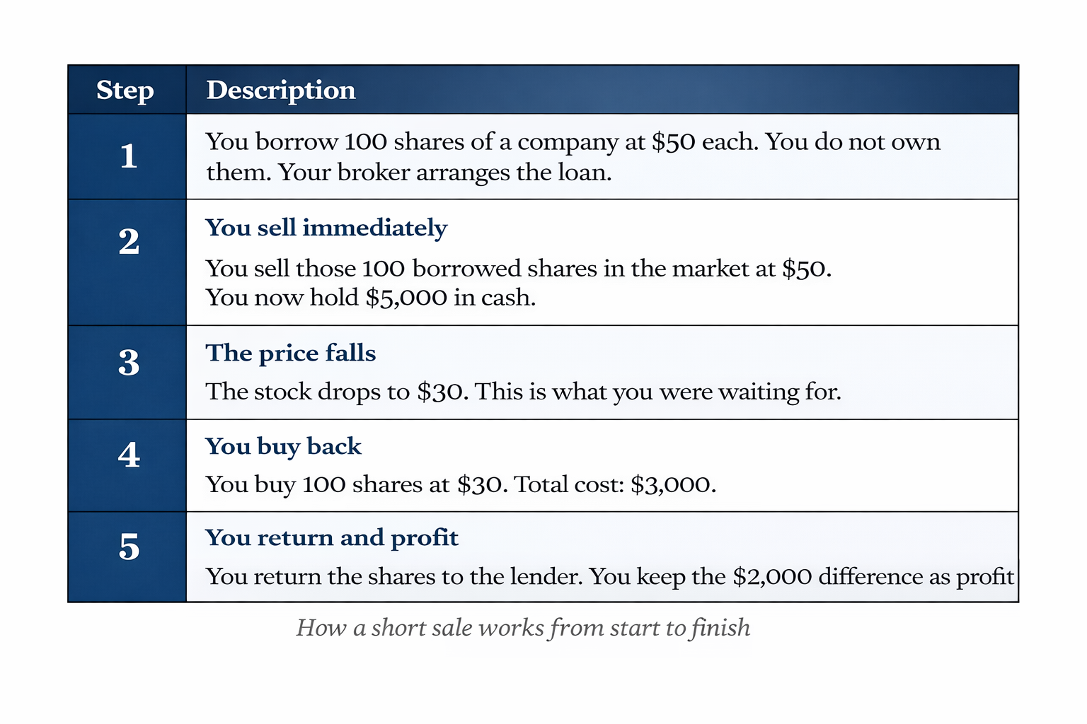 You borrow shares you do not own. You sell them at today's price. You wait for the price to fall. When it does, you buy them back at the cheaper price. You return the shares to the lender. The difference is your profit.